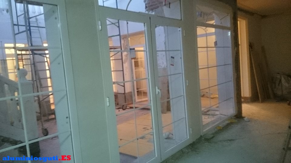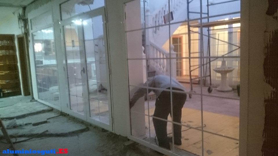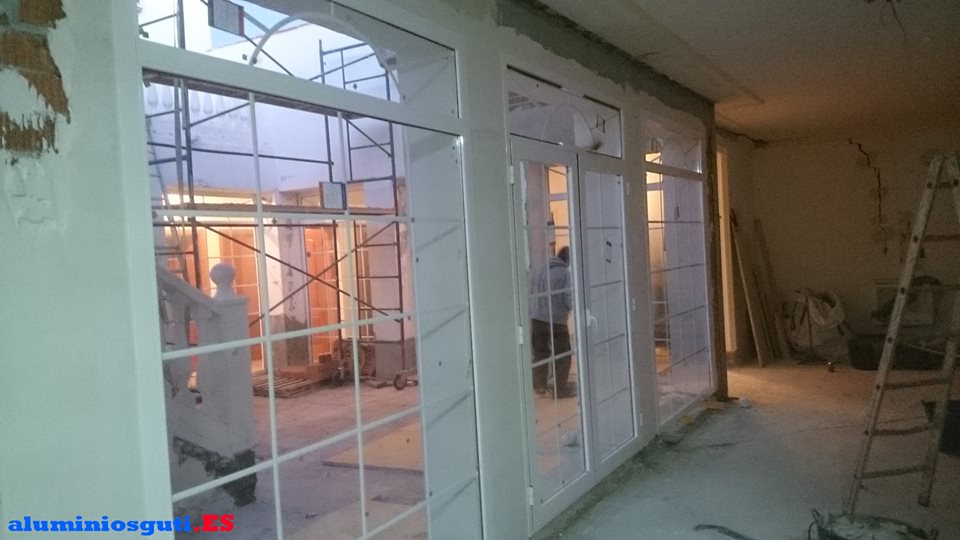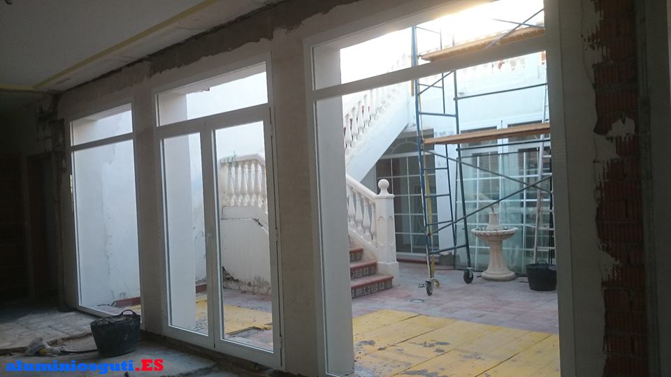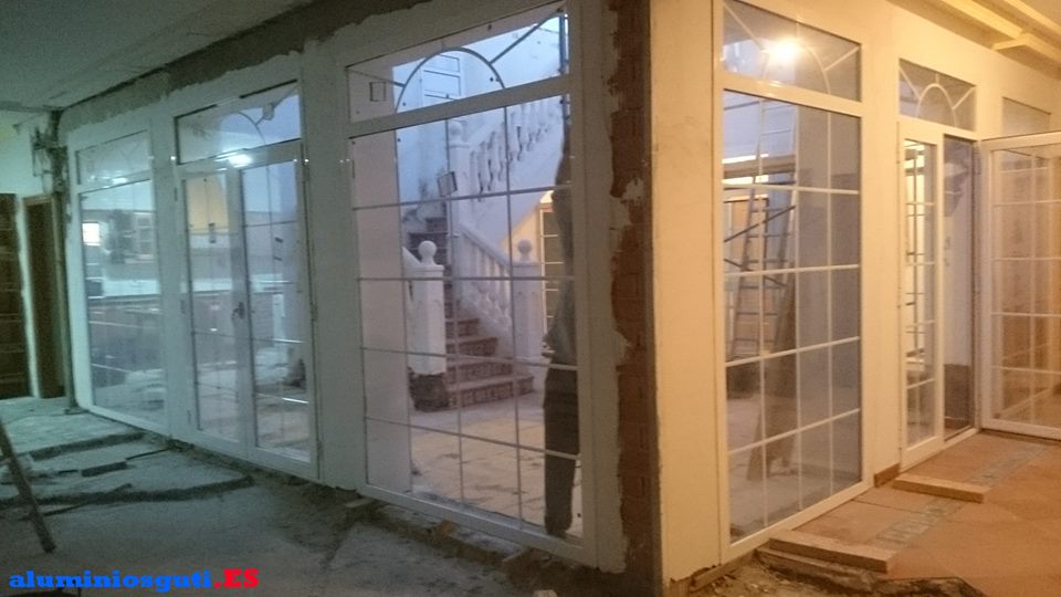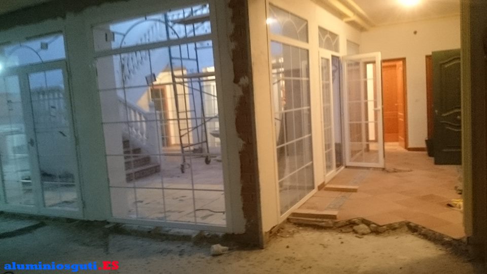 Cerramiento de patio en la serie mezquita barios modulos fijos y barias puertas de dos hojas con fijo superior, acristalamiento doble cristal climalit con palilleria de aluminio en su interior.