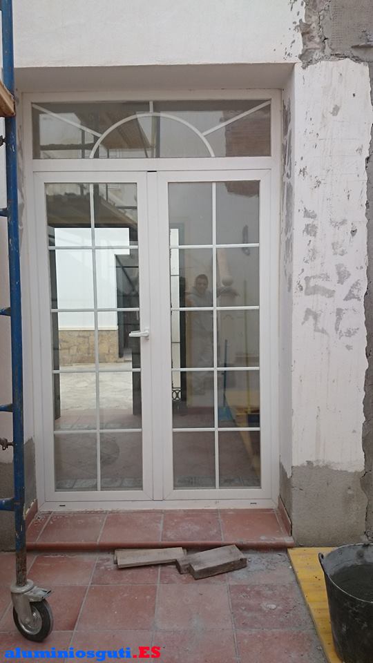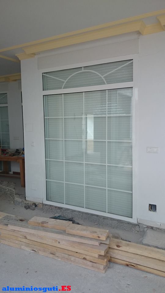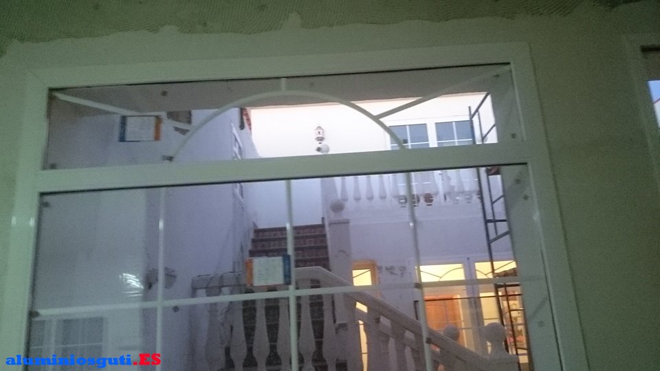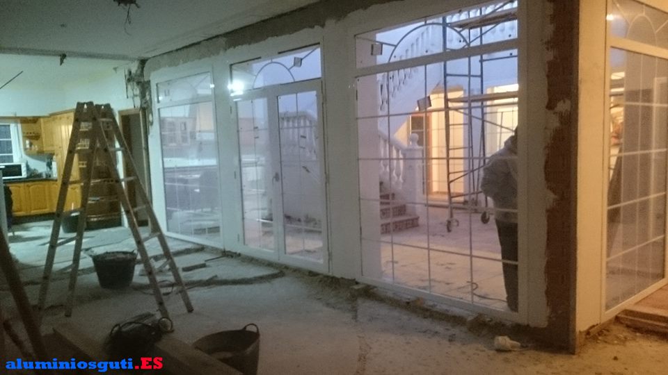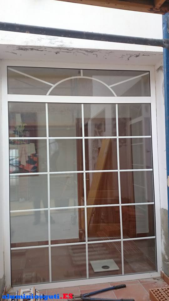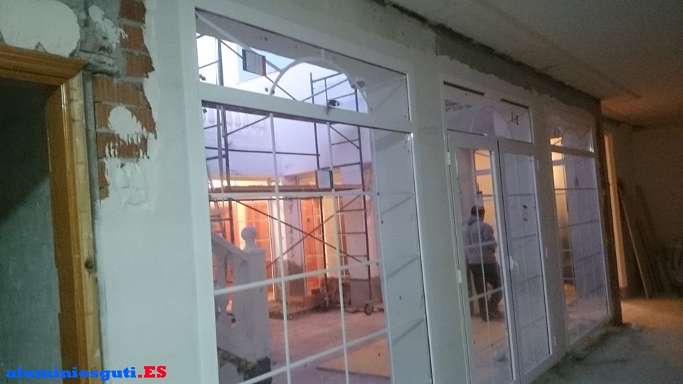 Cerramiento de patio en la serie mezquita barios modulos fijos y barias puertas de dos hojas con fijo superior, acristalamiento doble cristal climalit con palilleria de aluminio en su interior.
