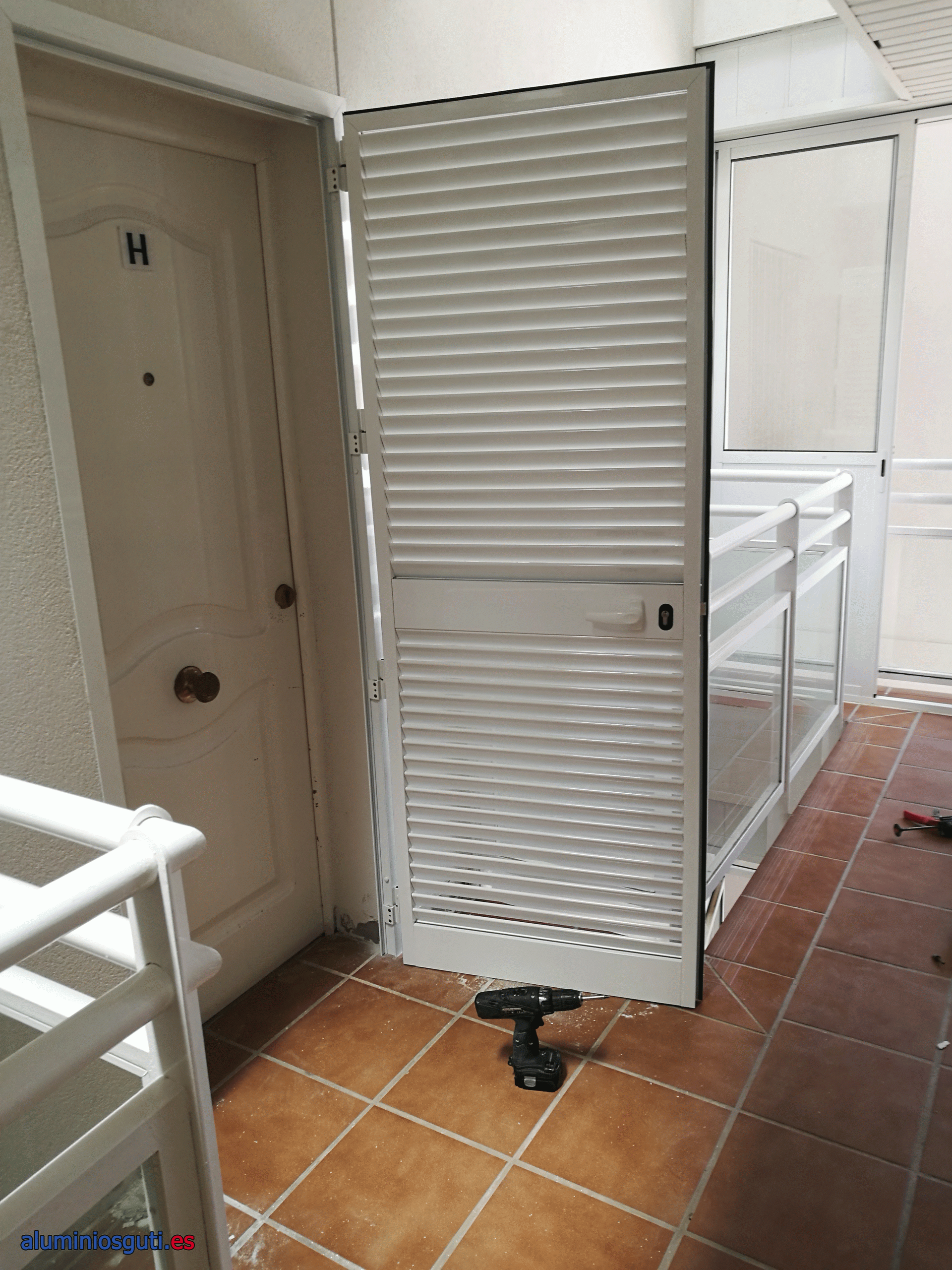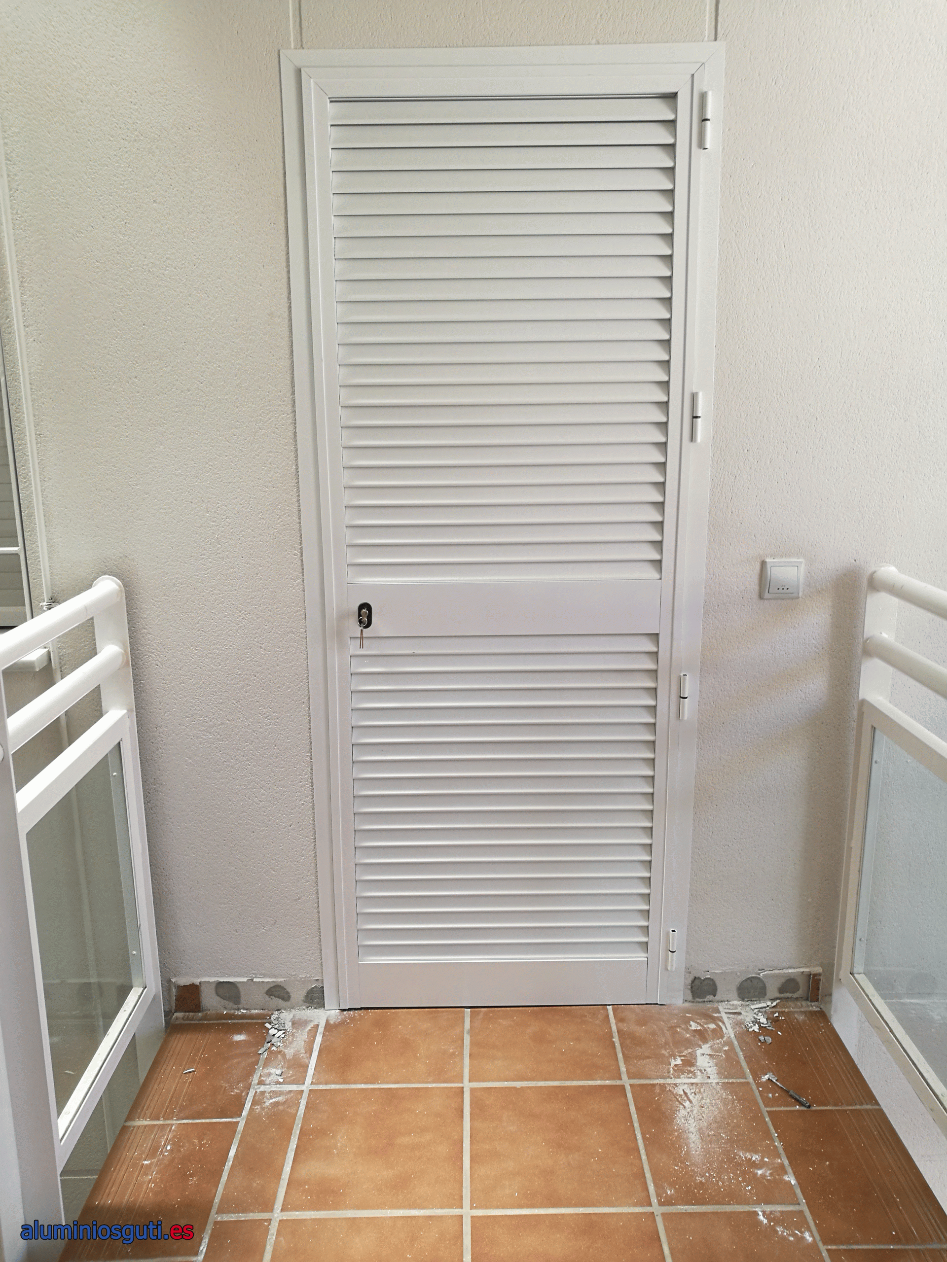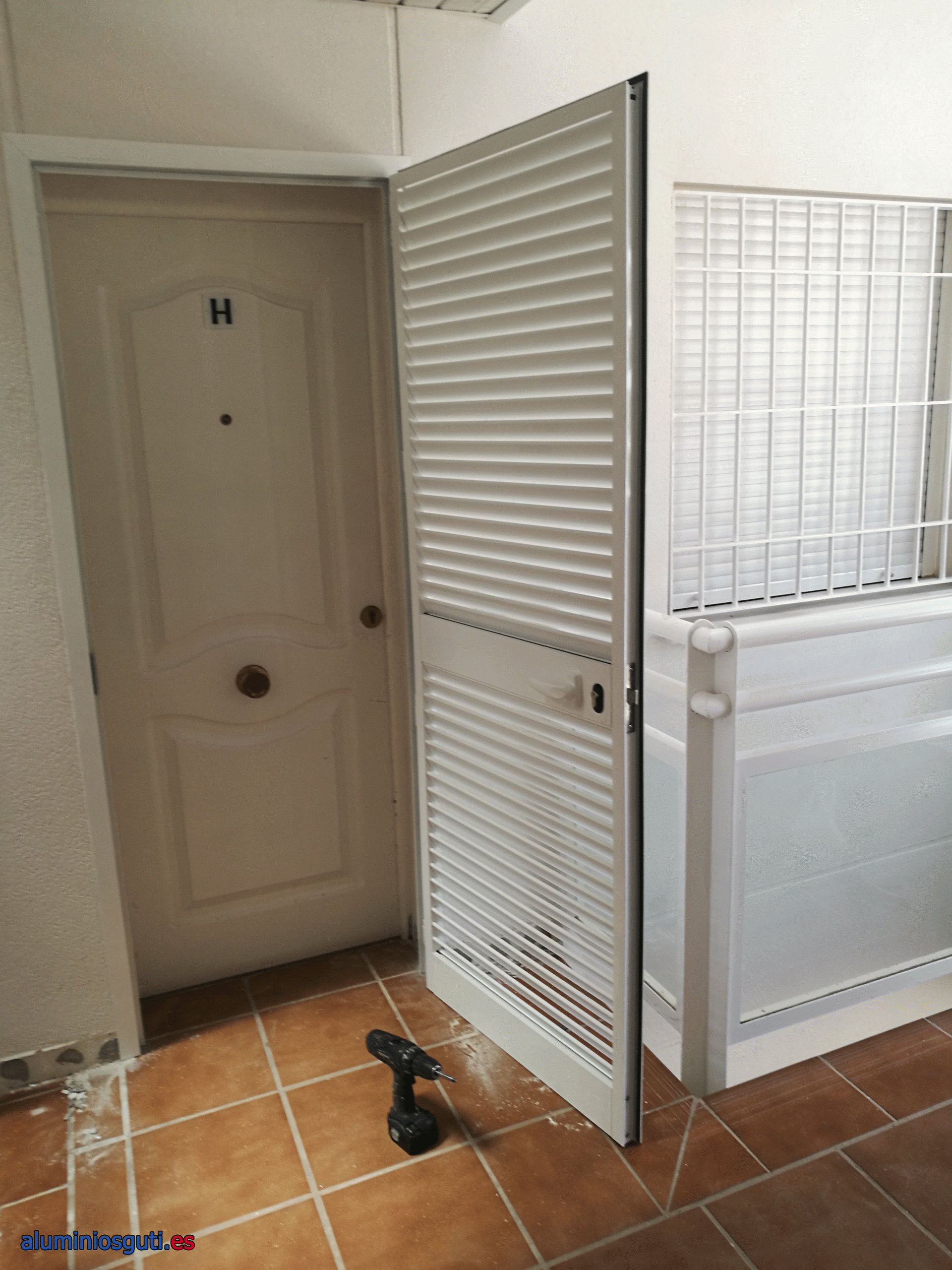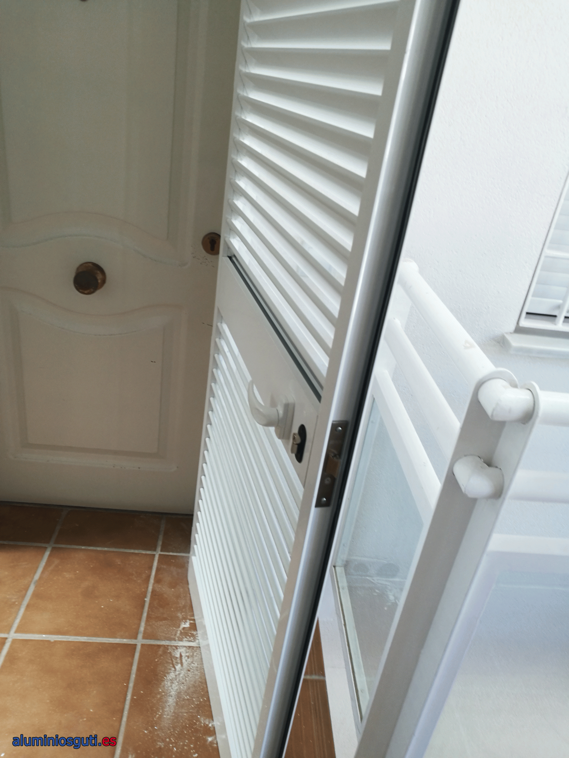 Cancela para entrada de vivienda en la serie Mallorquina en color blanco con maneta interior y cerradura.