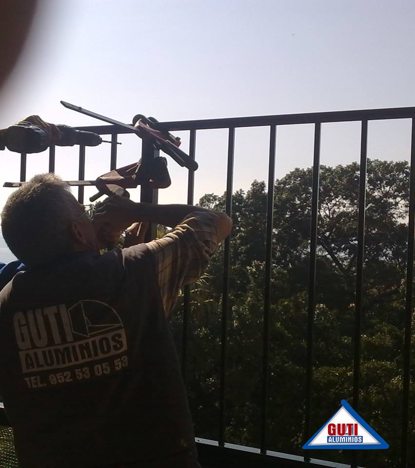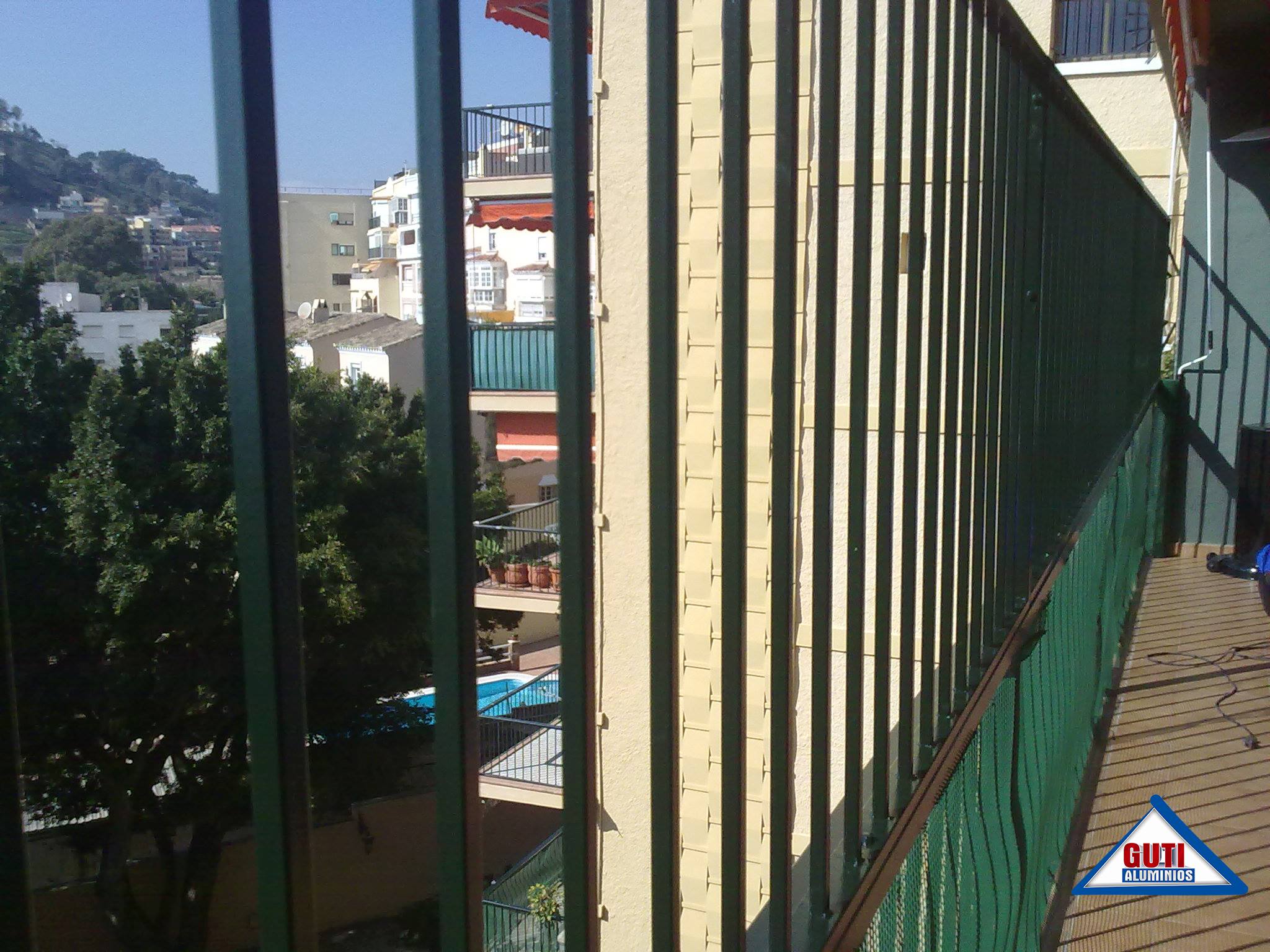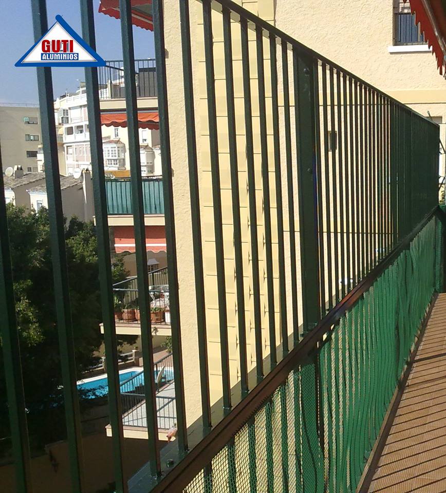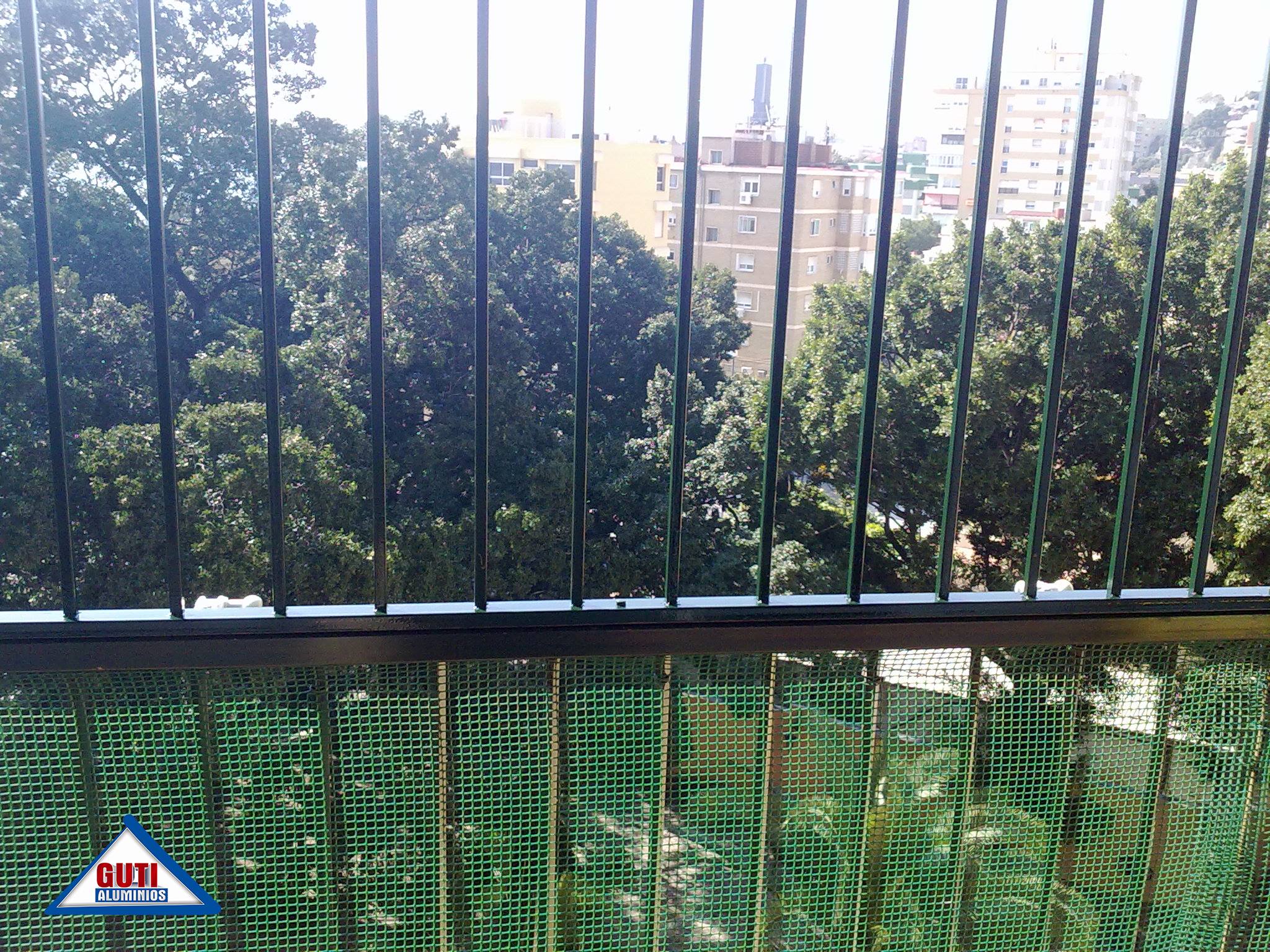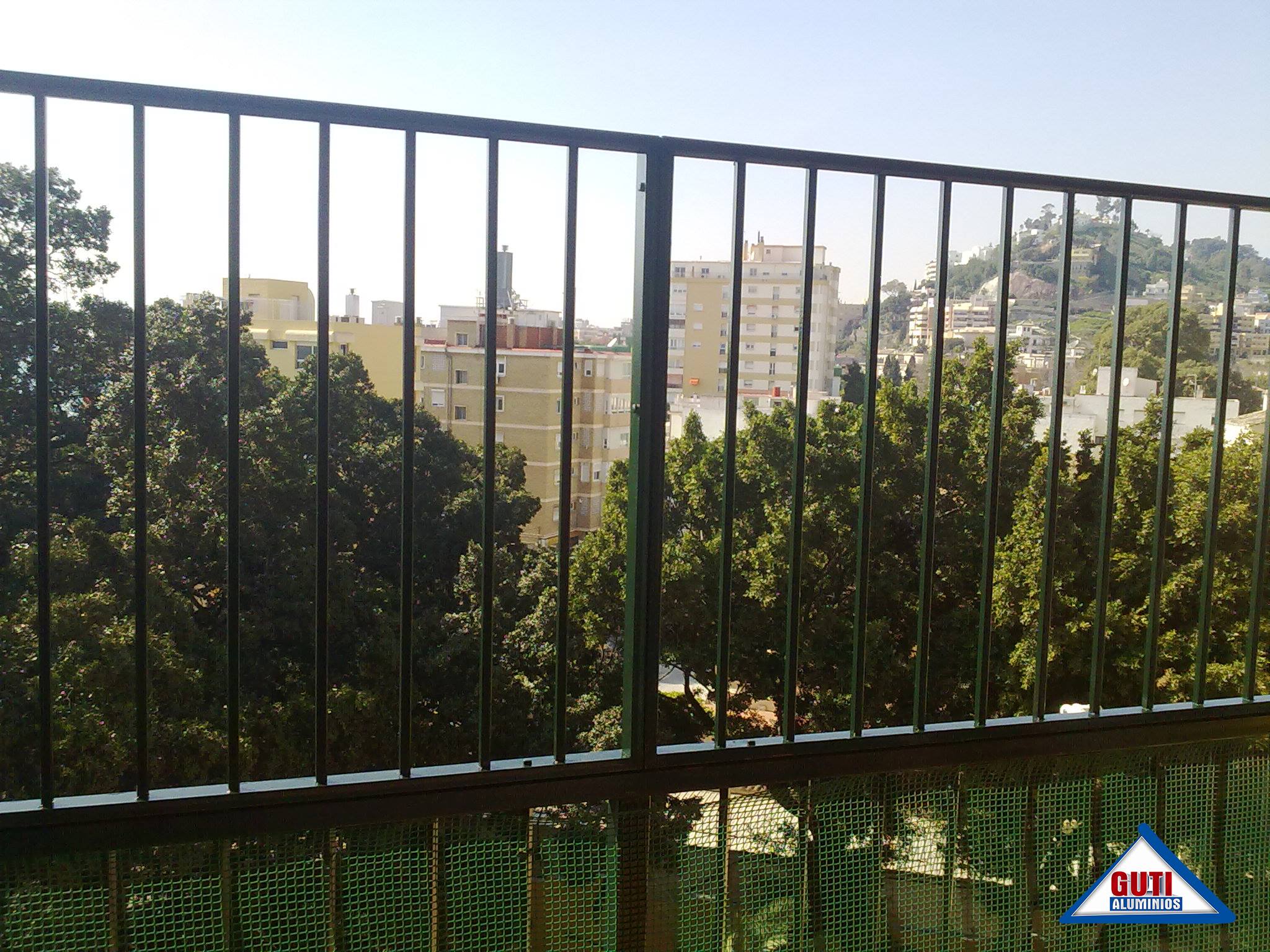 Instalación de dos tramos de baranda de hierro instalada en Málaga capital. Fabricada con barrotes cuadrados y pasamanos rectangular .Pintura dos capa de pintura anticorrosiva y tres capas de pintura en color verde satinado.