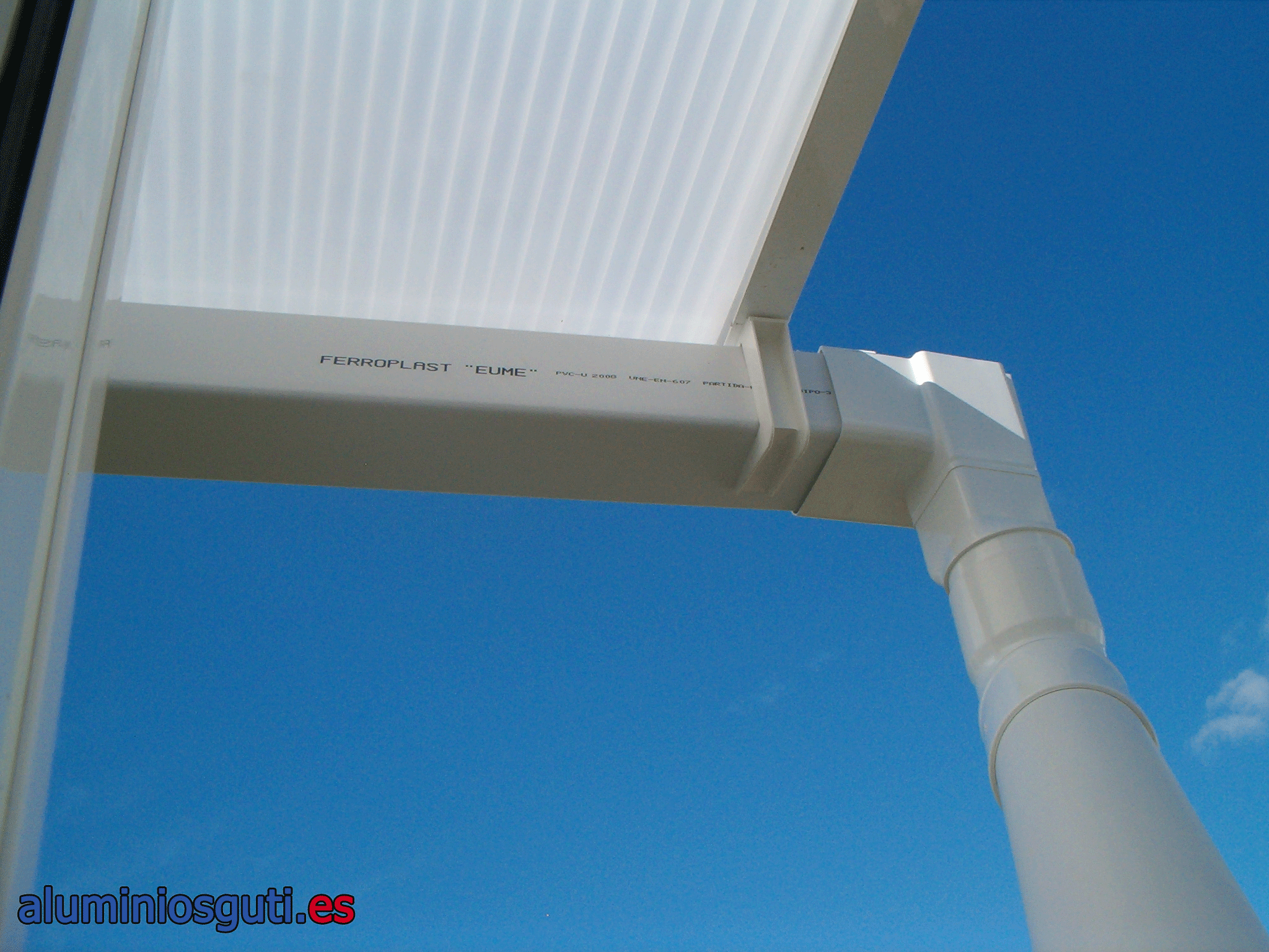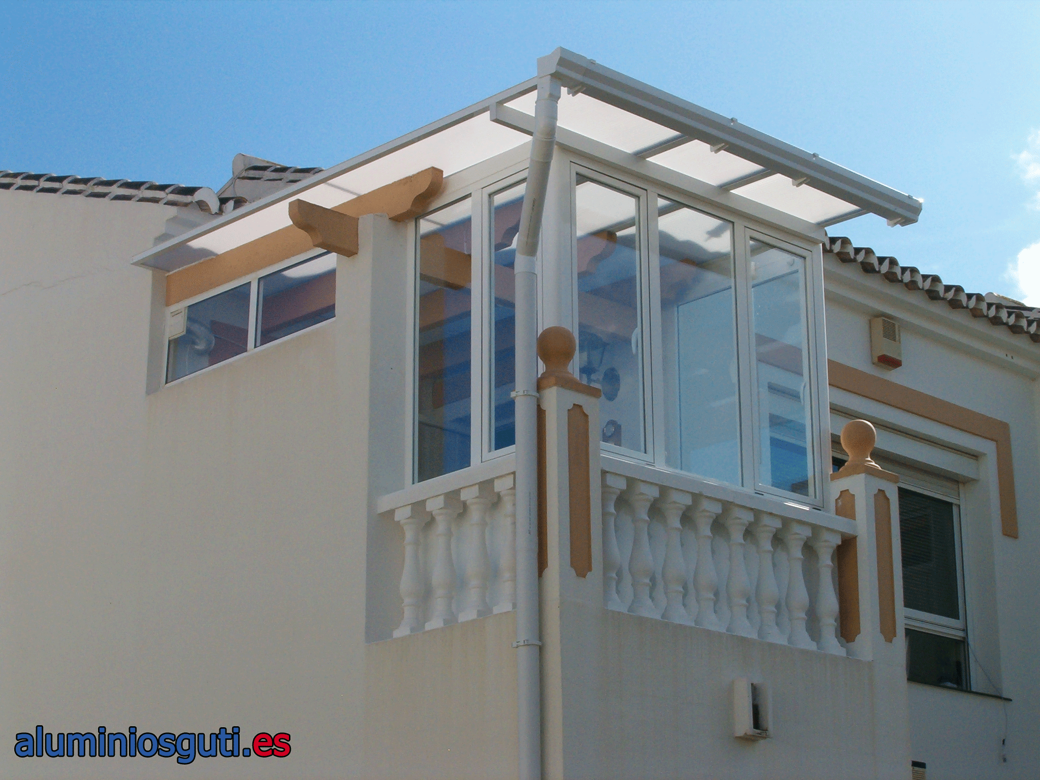 Serie Mezquita habitación de aluminio con cristal transparente de 4 mm. Tejado en pilastra con junquillo y chapa policarbonato traslucido. Canaleta y bajante en pvc.