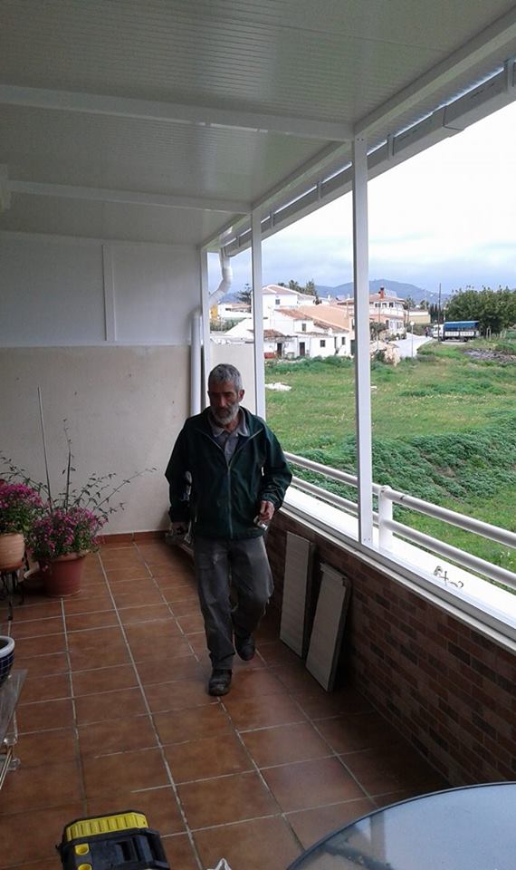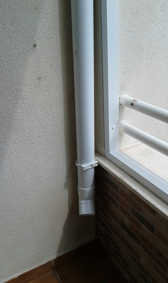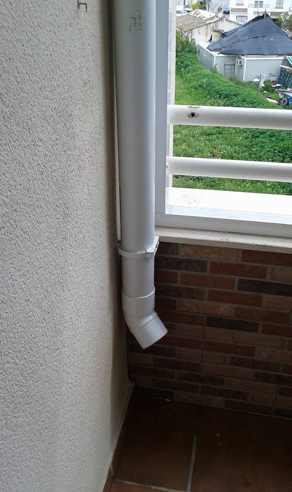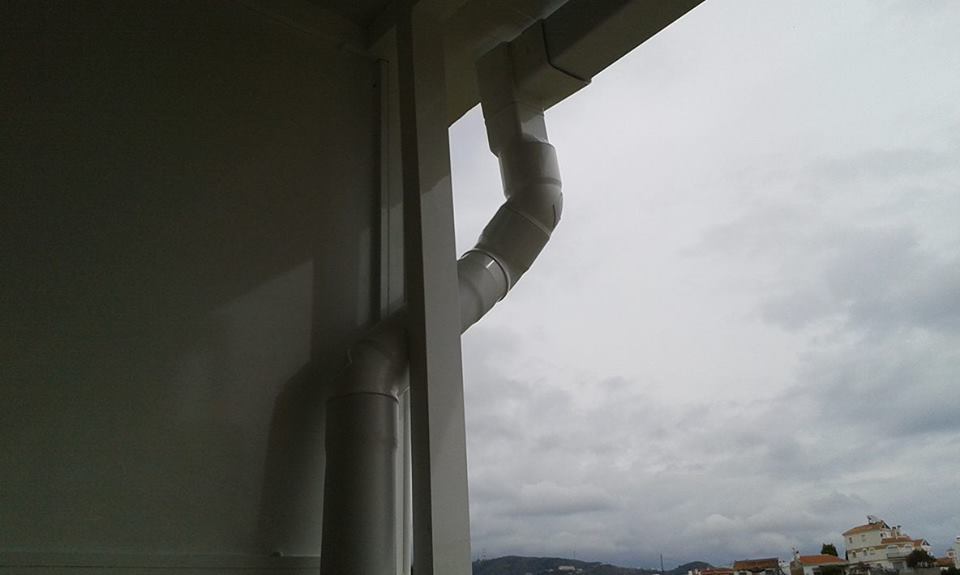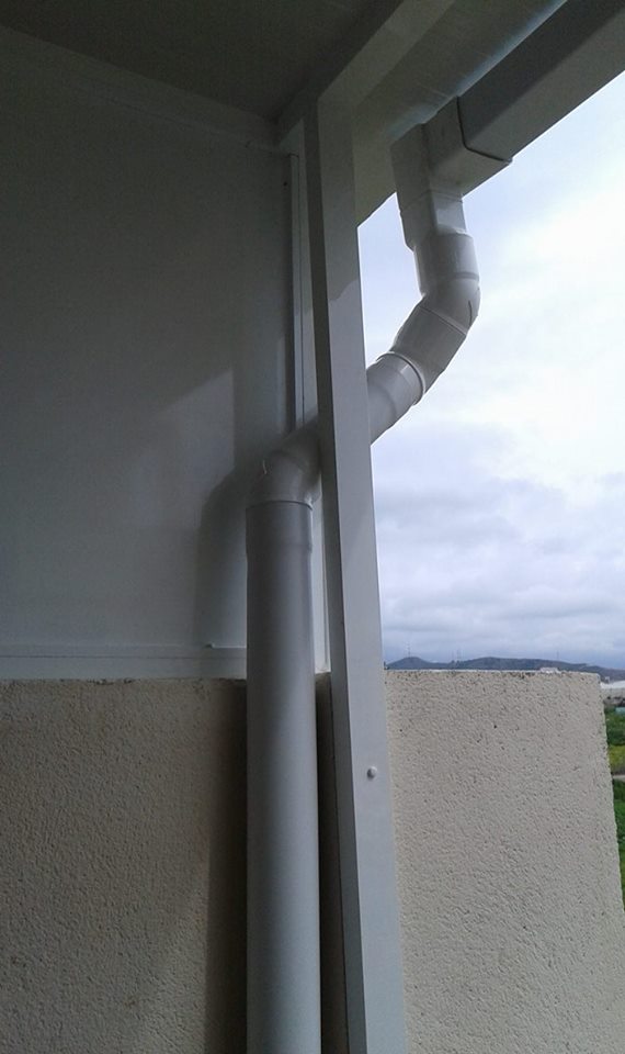 Canalón de pvc a medida, bajante en tubo de pvc con semicodos para dirigir el bajante al interior para recoger el agua de lluvia para regar las macetas.