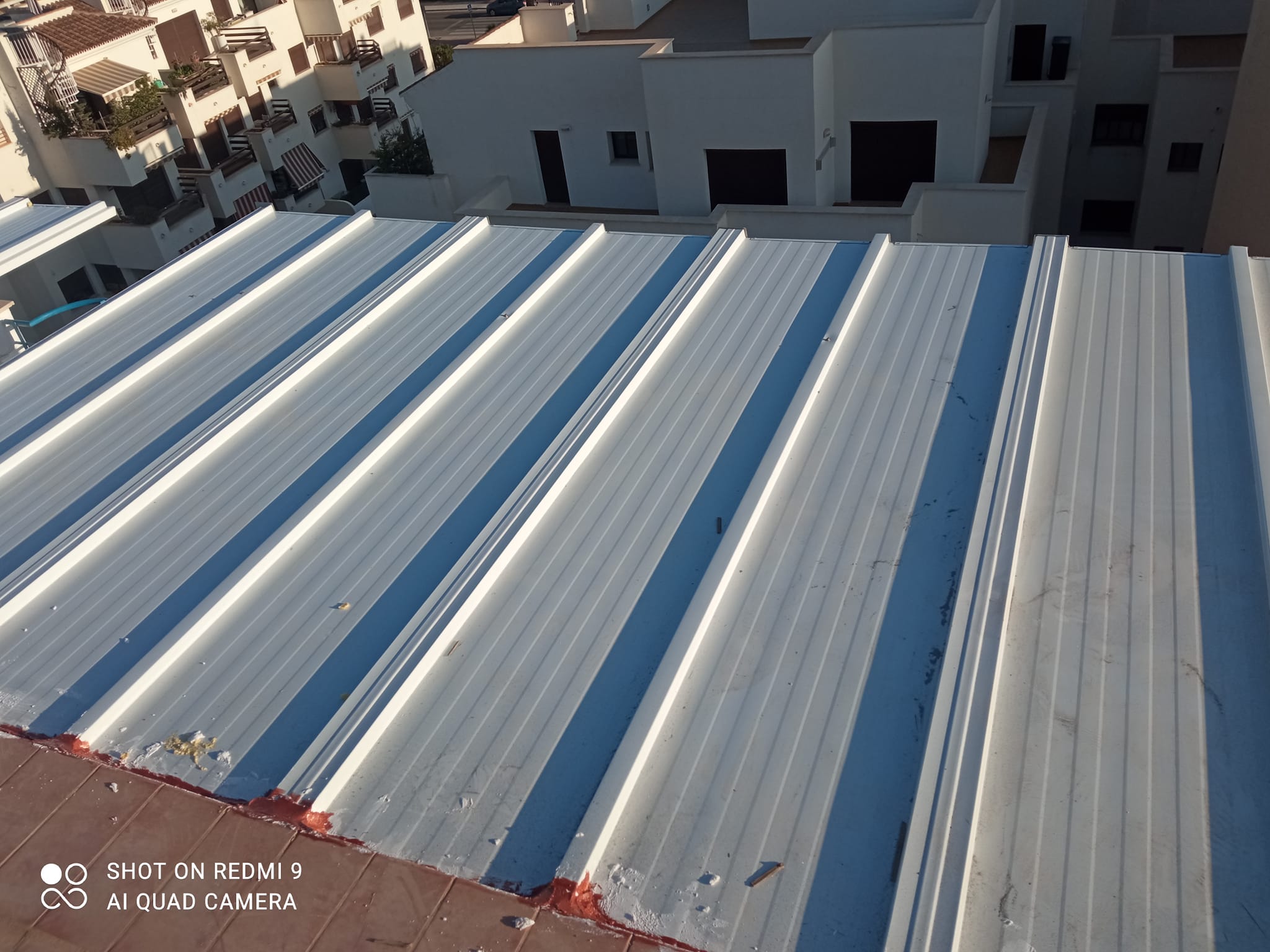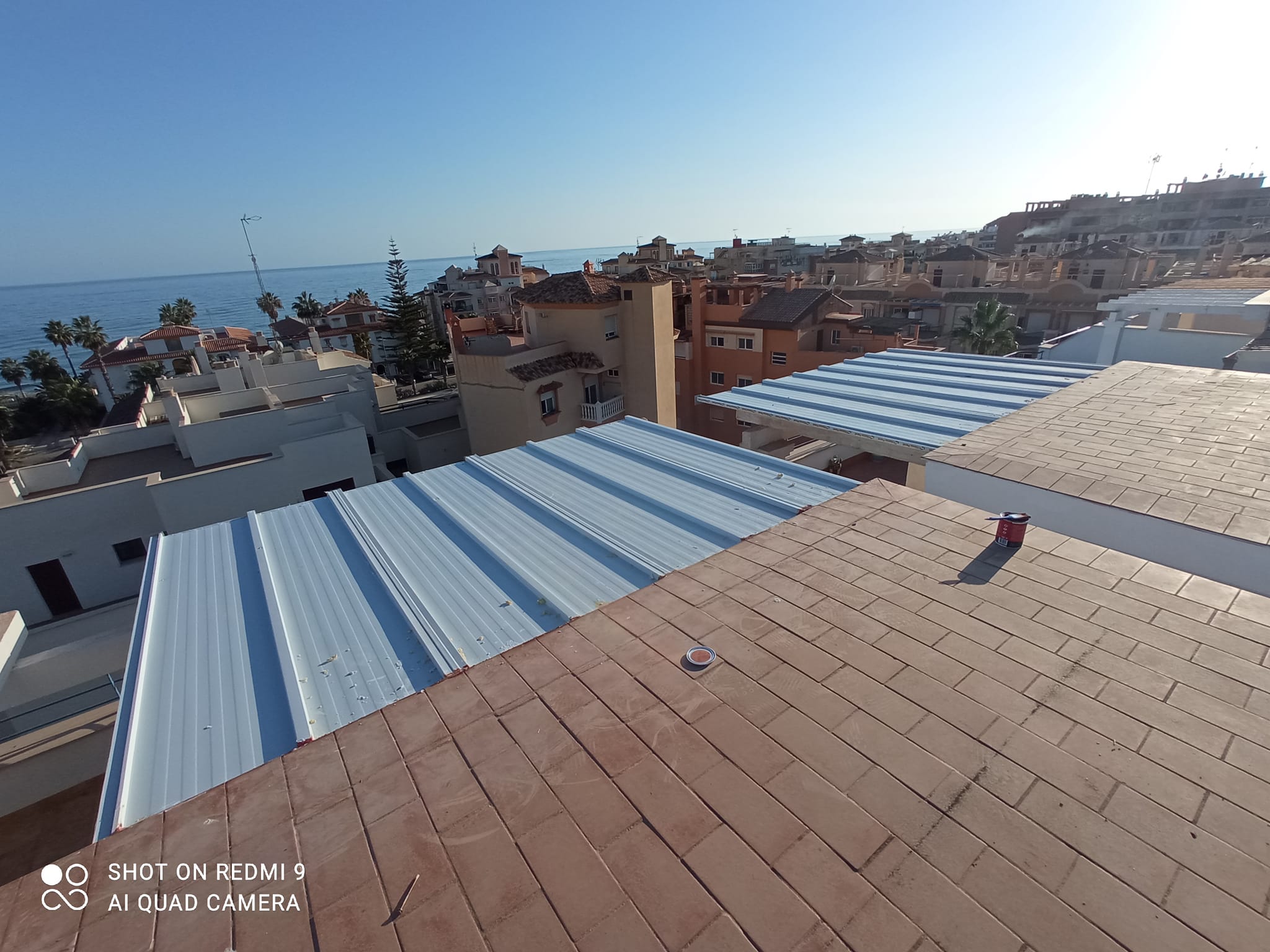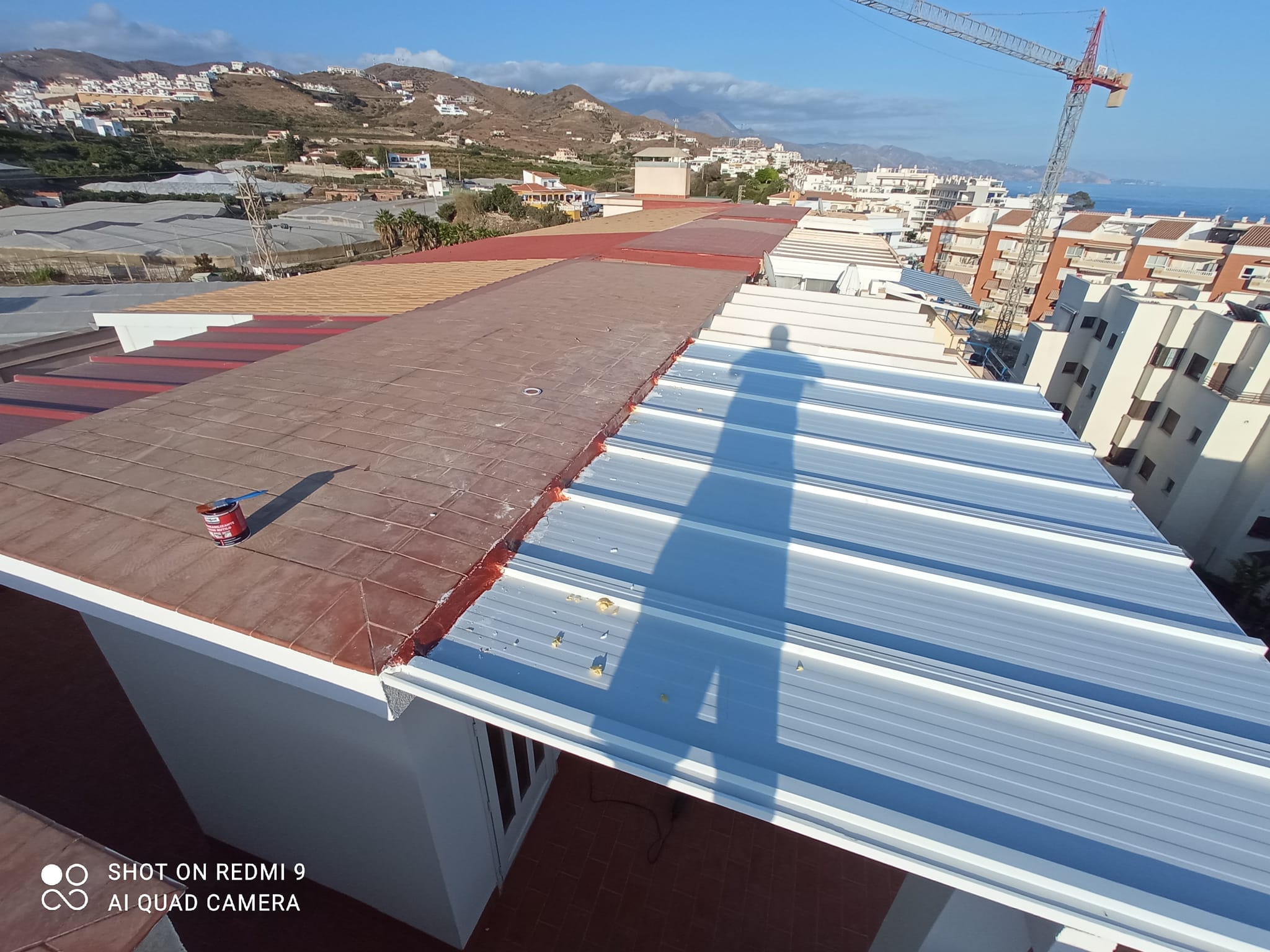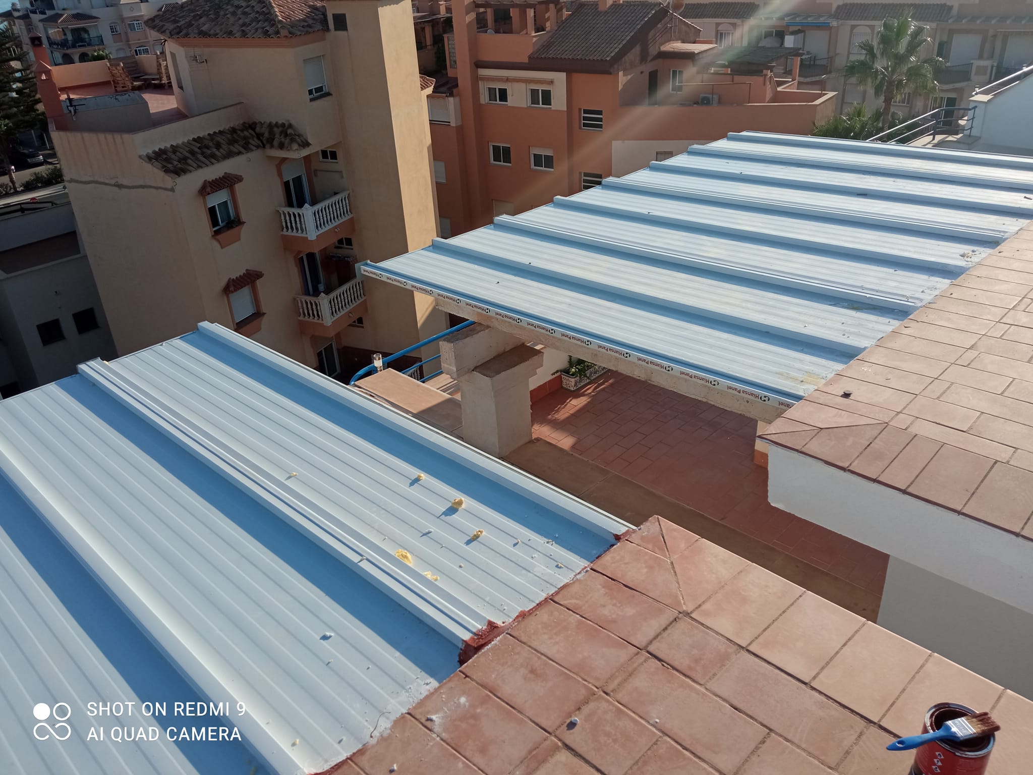 tejados en chapa cubierta instalado sobre la bigas de pergola de hormigón. Relleno de cemento por la parte exterior con varias capas de pintura de caucho.