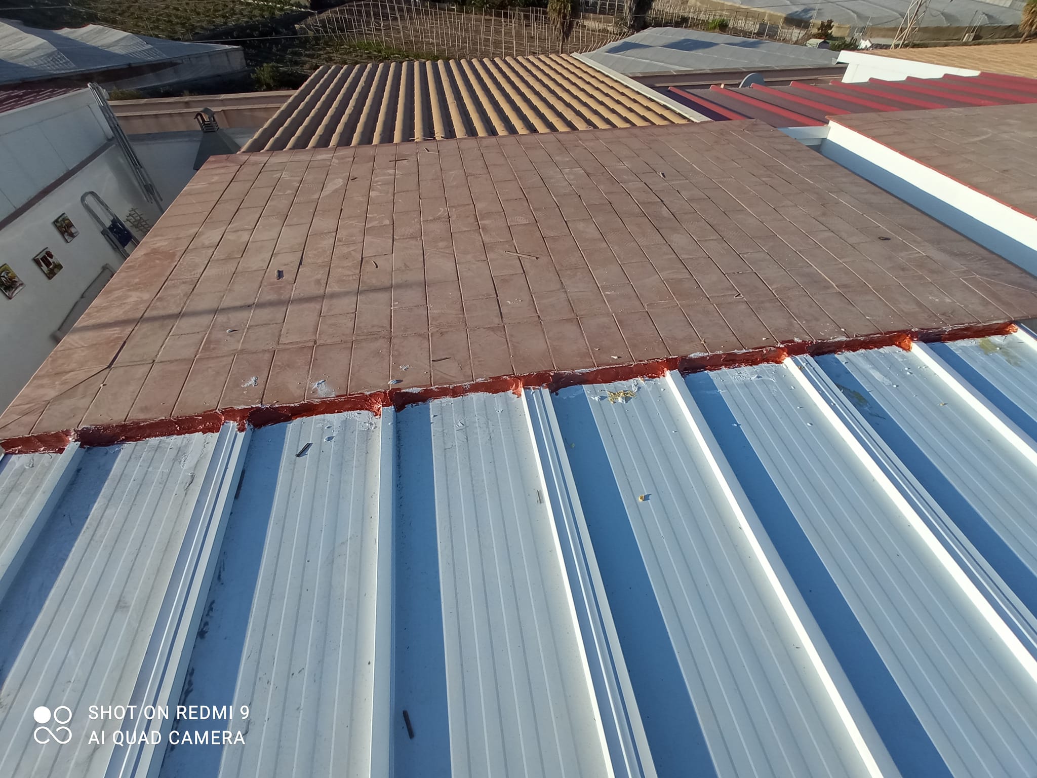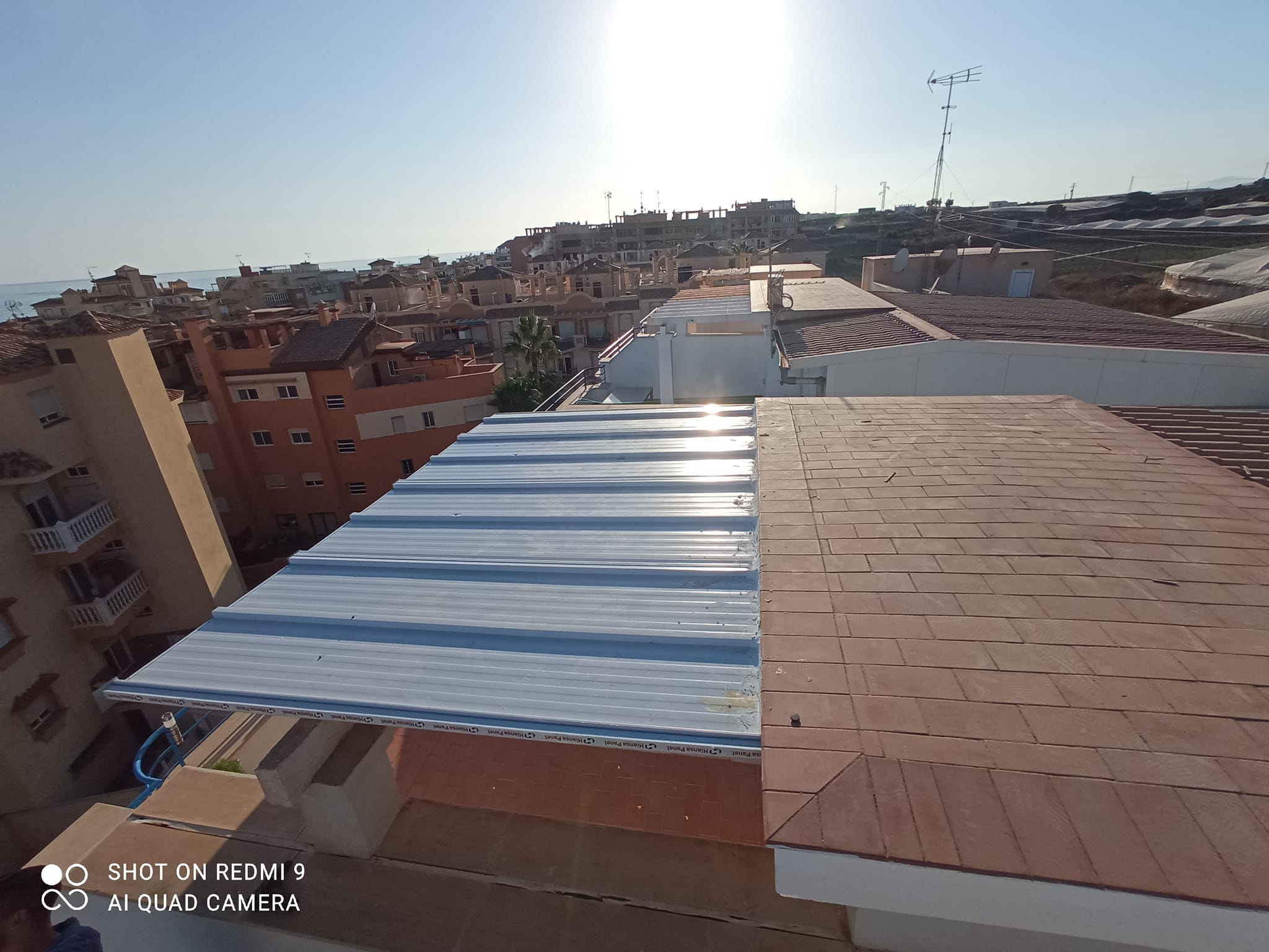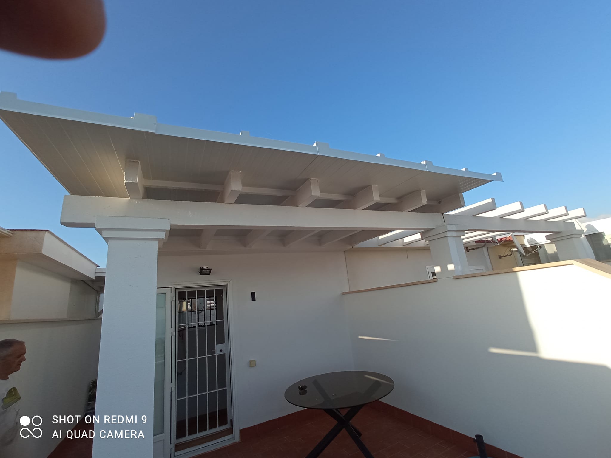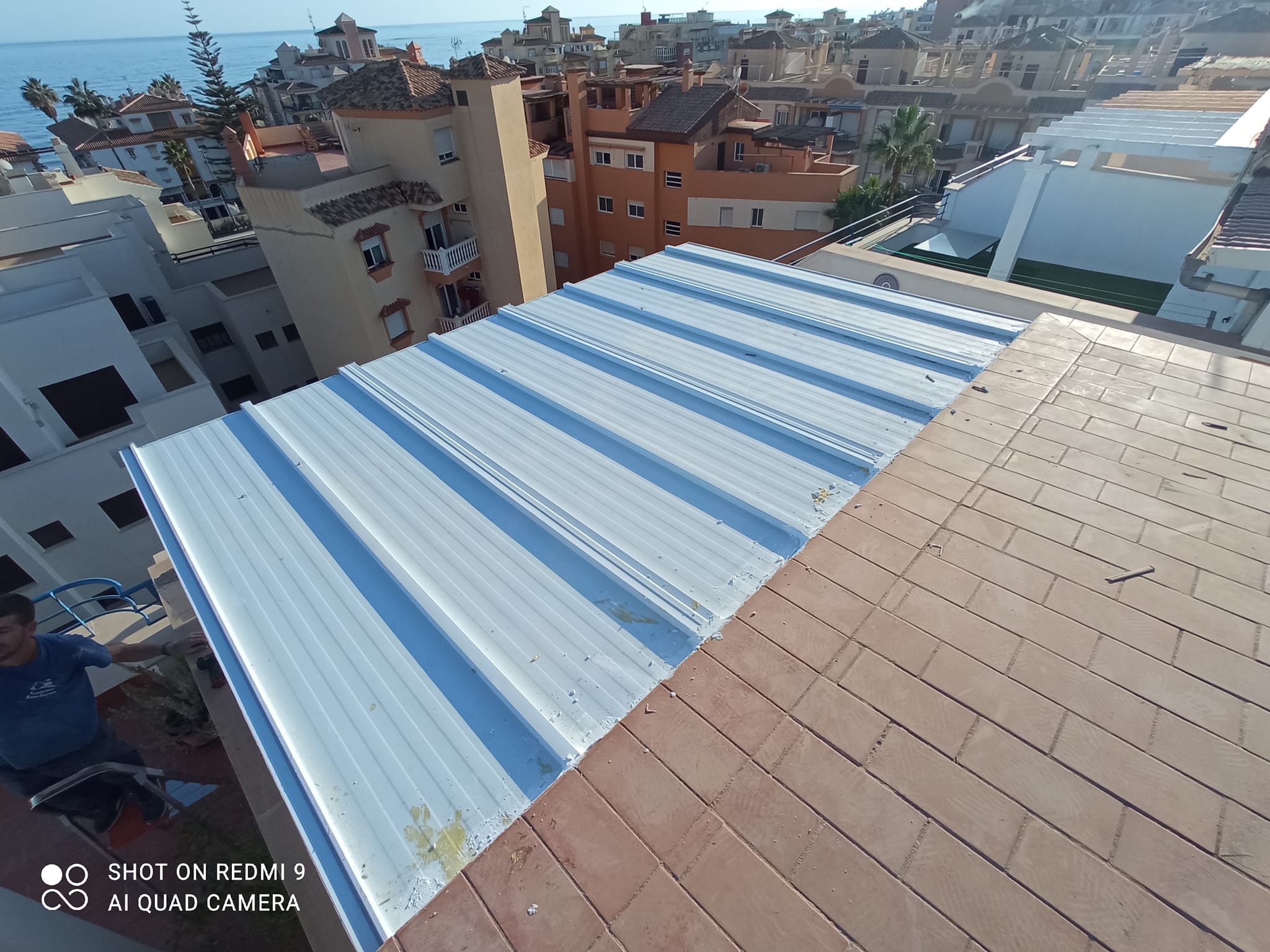 tejados en chapa cubierta instalado sobre la bigas de pergola de hormigón. Relleno de cemento por la parte exterior con varias capas de pintura de caucho.