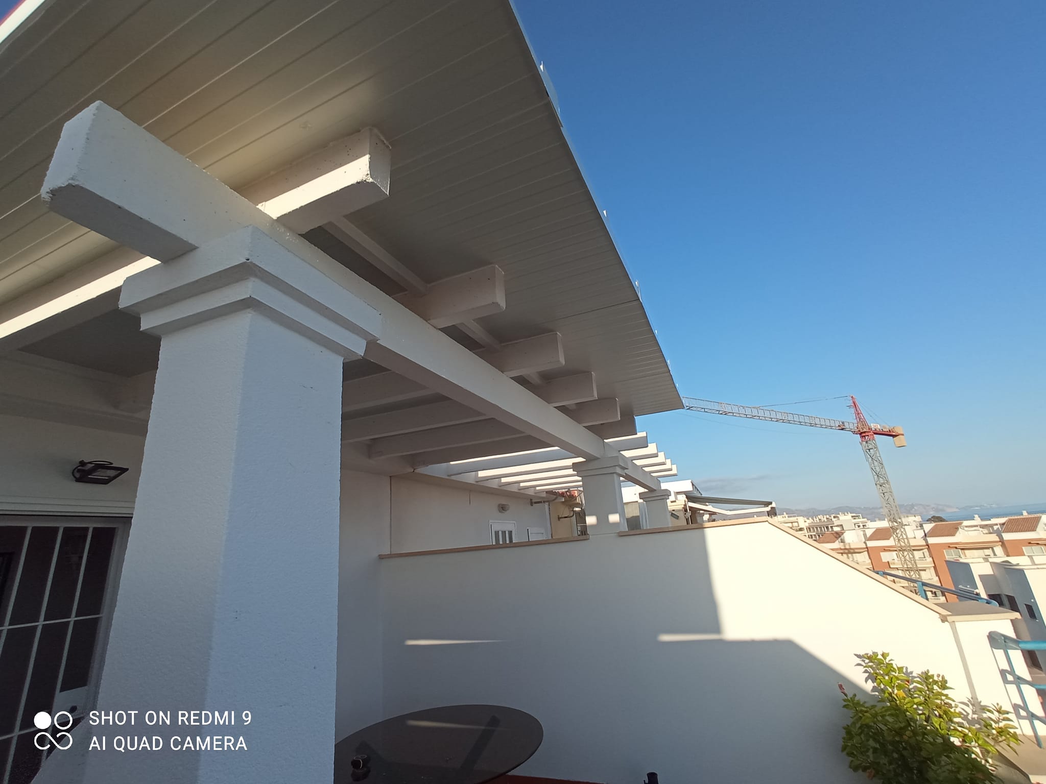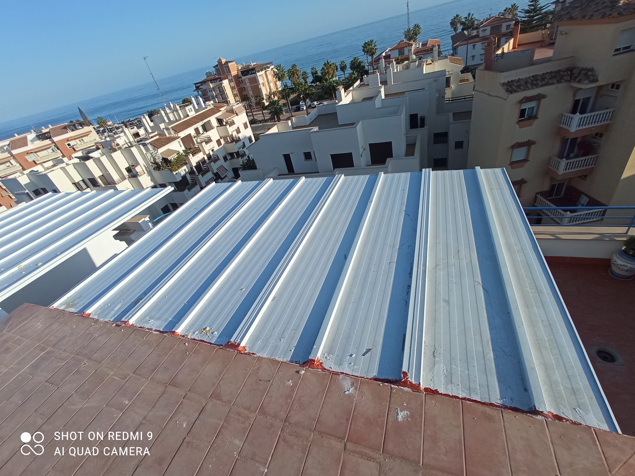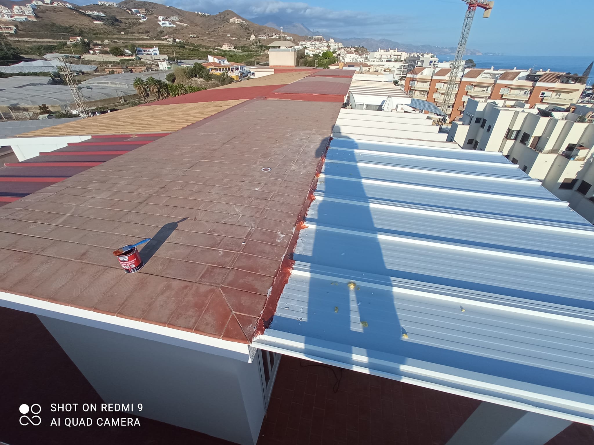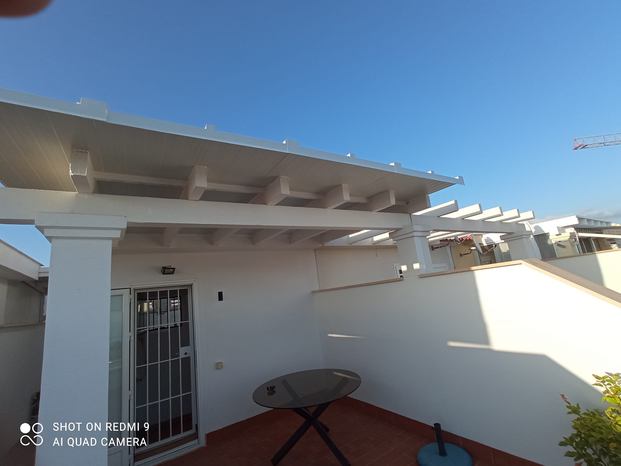 tejados en chapa cubierta instalado sobre la bigas de pergola de hormigón. Relleno de cemento por la parte exterior con varias capas de pintura de caucho.