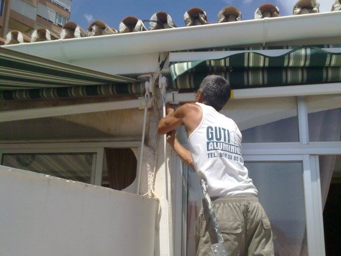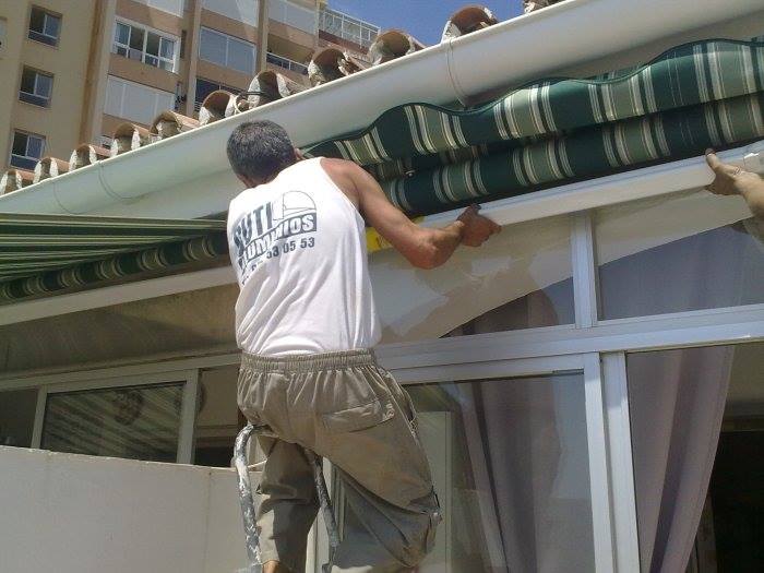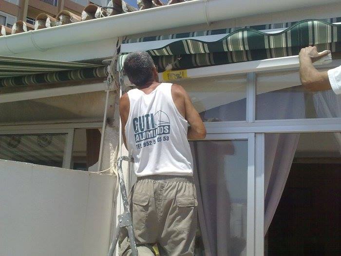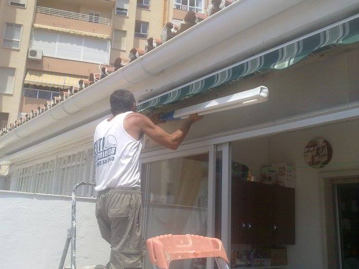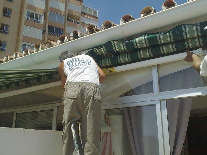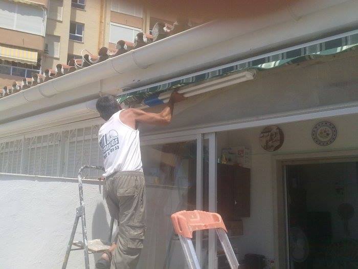 Toldo con brazos articulados instalado en terraza en urbanización de Torrox costa junto al paseo marítimo de Torrox instalación con tornillos y tacos a la pared.