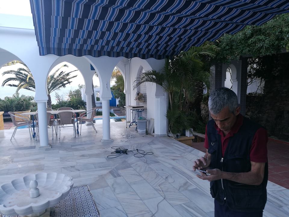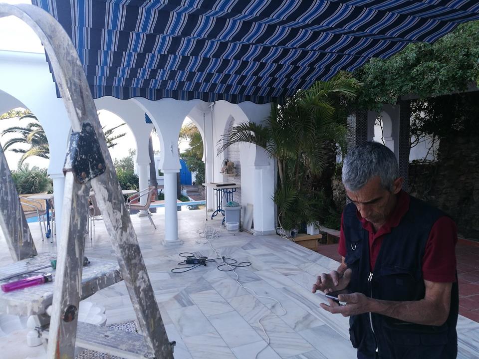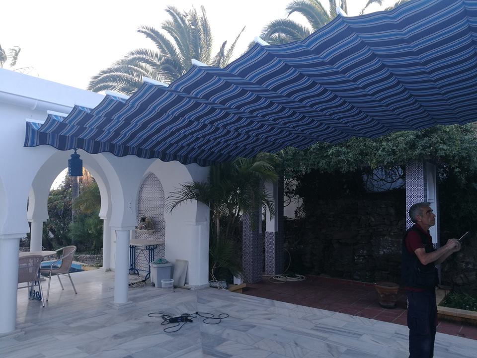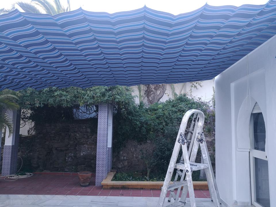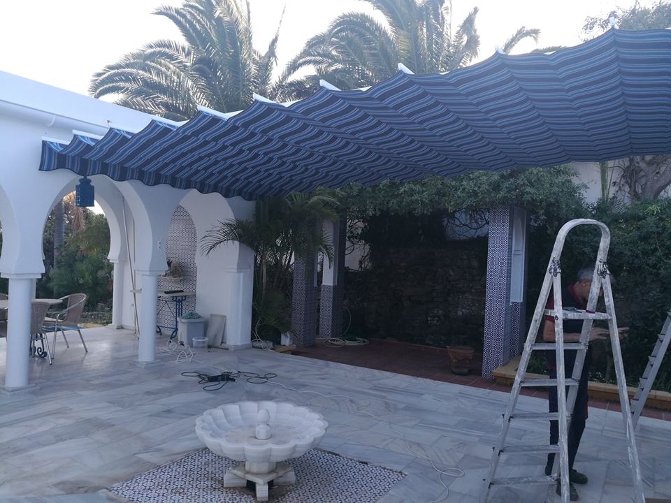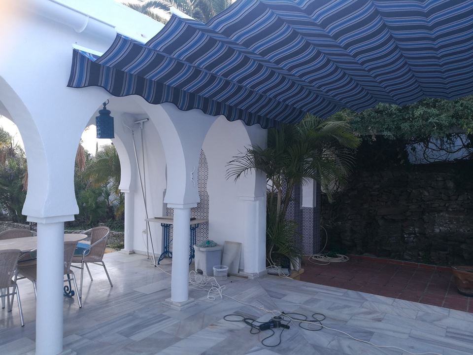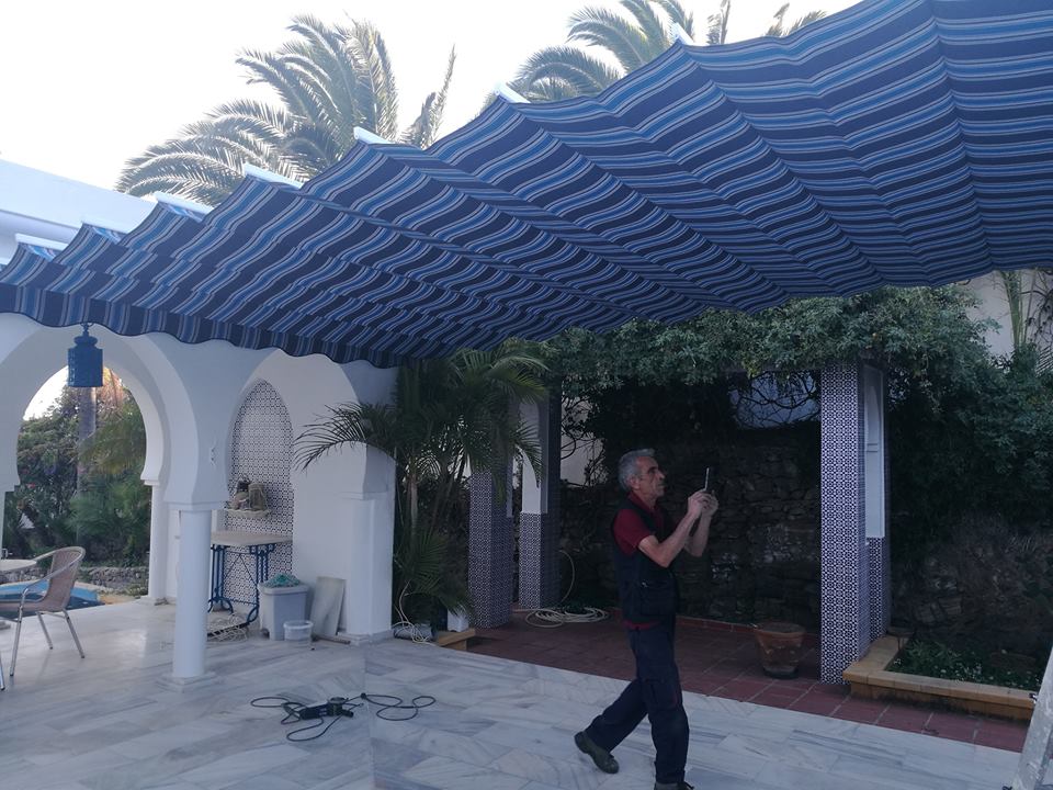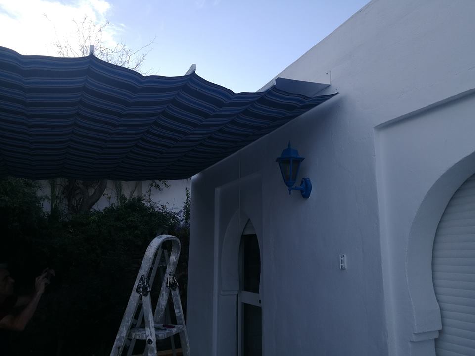 Toldo de palilleria con dos guias entre paredes para deslizar el toldo, toldo en un paño con cuerda de nailon y soporte en pared para enrollar y sujetar la cuerda, visera de aluminio instalada en la parte superior del toldo para protegerlo de la lluvia y de el sol cuando se encuentre plegado para que te dure el doble de tiempo.