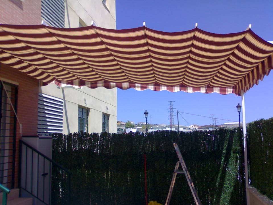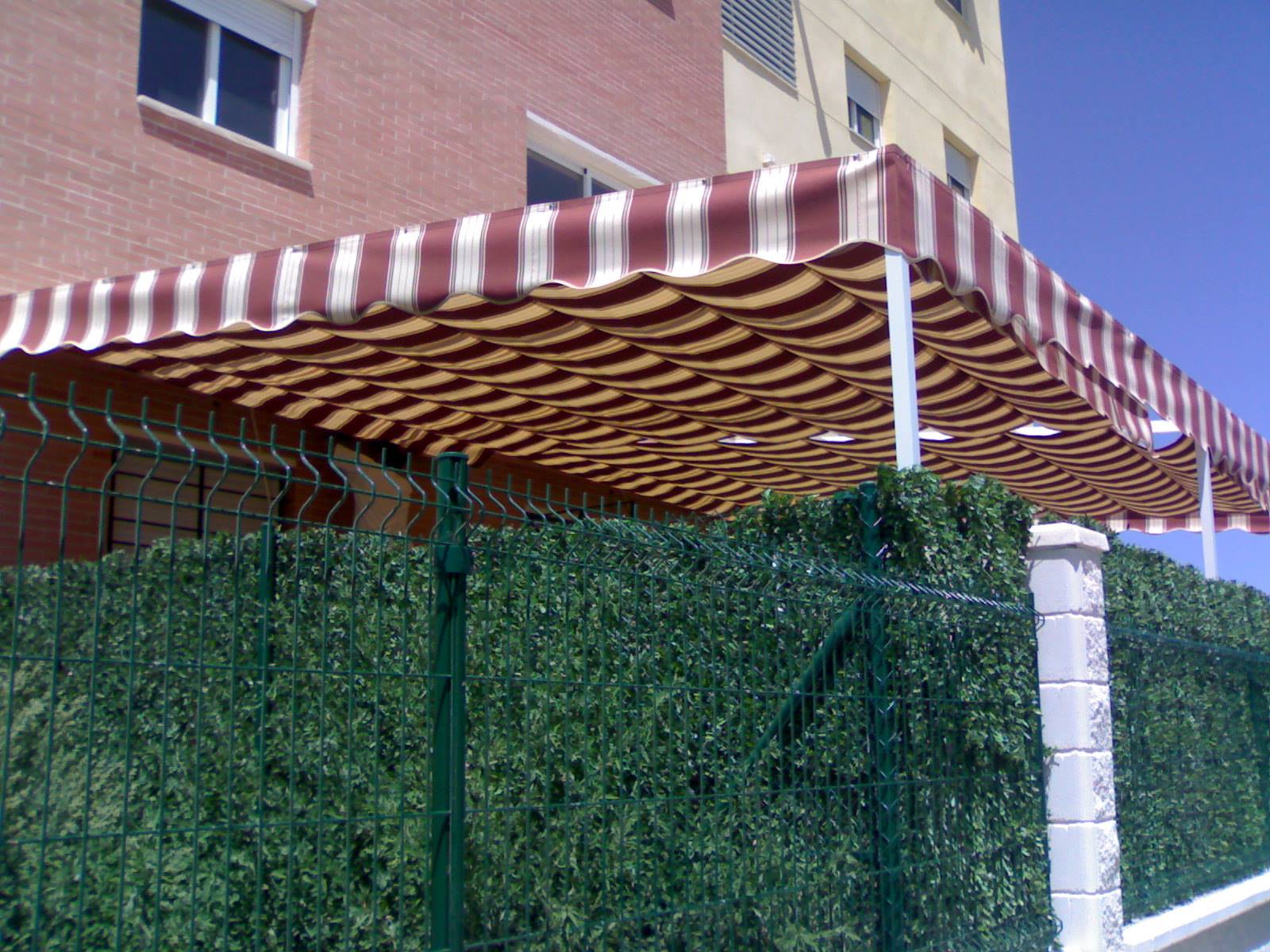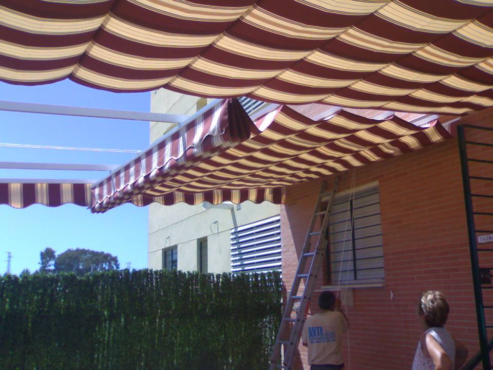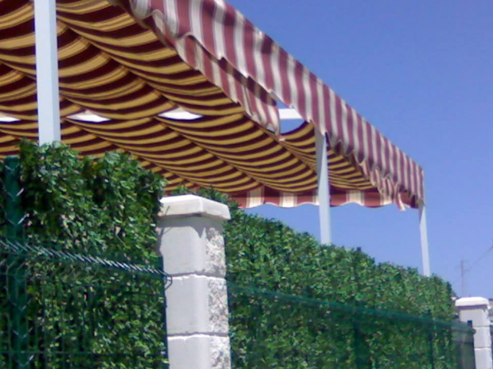Toldo con estructura de aluminio en tubos 60×40 en color blanco, cuatro guías de aluminio para deslizar los dos paños mediante carruchas con cuerdas de nailon, soporte en la pared para sujetar la cuerda.