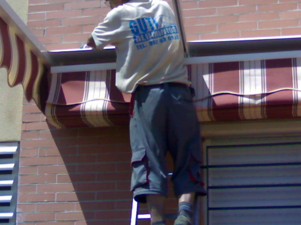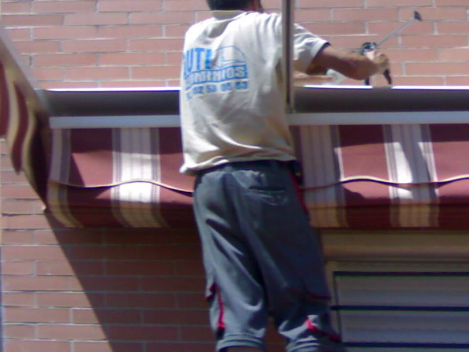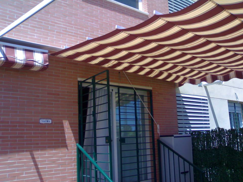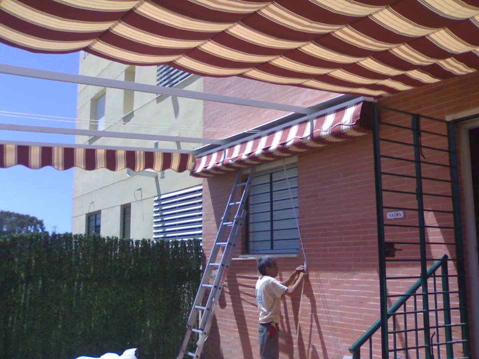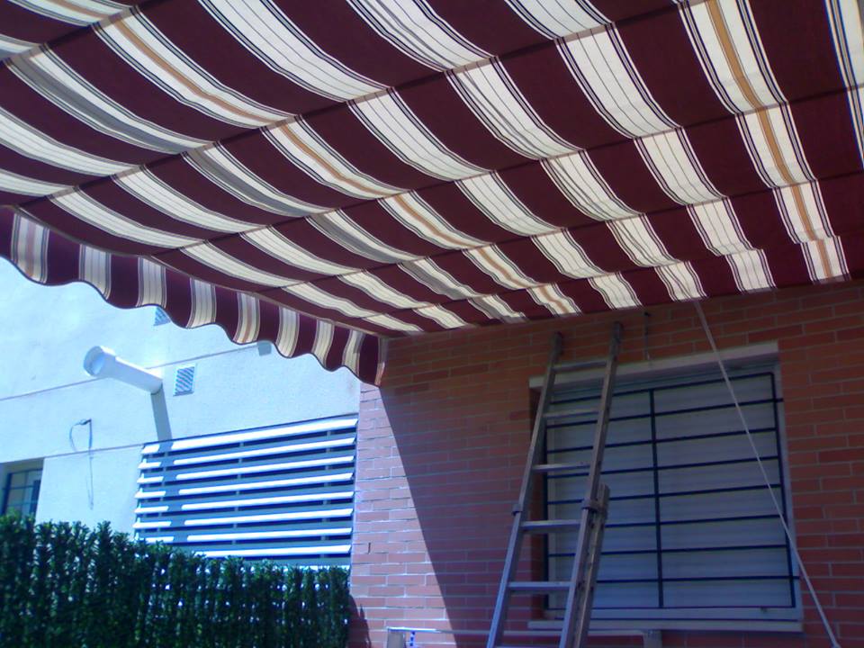 Toldo con estructura de aluminio en tubos 60×40 en color blanco, cuatro guías de aluminio para deslizar los dos paños mediante carruchas con cuerdas de nailon, soporte en la pared para sujetar la cuerda.